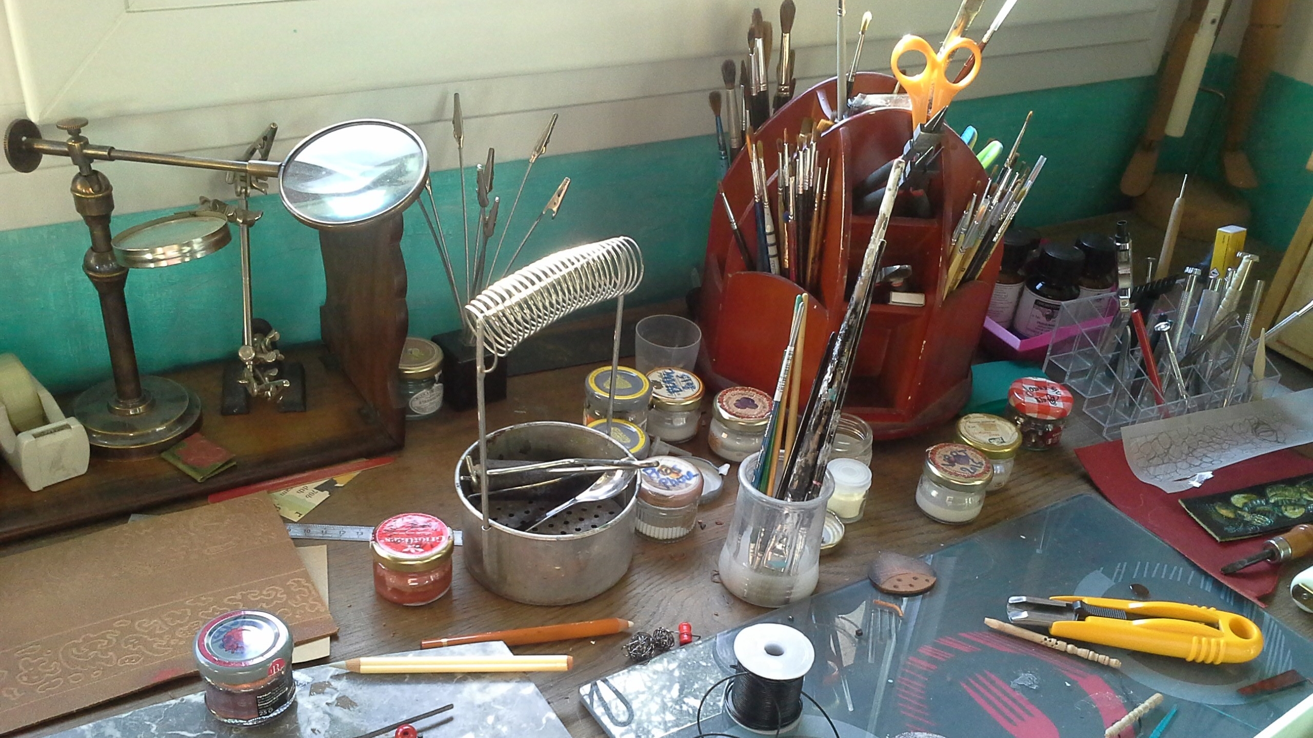 Réinventant toutefois la technique du décor sur cuir (car autodidacte en maroquinerie) pour la gravure mais aussi pour la sculpture.