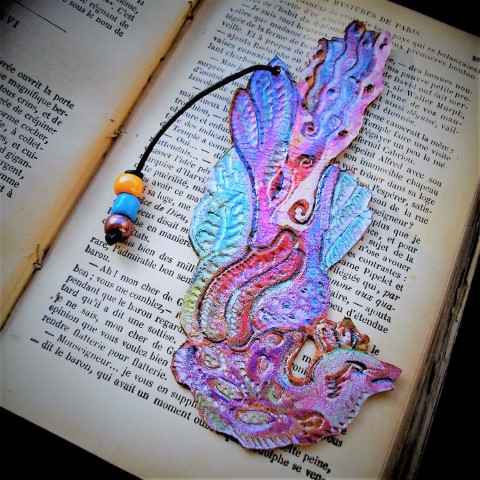 Mes modèles de marque-pages sont en cuir. Mon travail est exclusivement fait main. Les dessins s’inspirent de motifs piochés dans de nombreux univers. Des références à l’art, des fusions de styles, une liberté sur la technique pour un rendu toujours en quête de beauté et d’harmonie. De ces décors peints, gravés, estampillés, subtils et chatoyants, des signets ( fil de cuir ou de coton) accompagnent les marque-pages. Des perles accordées aux couleurs de la pièce en cuir ou du graphisme. Ce signet vient se poser naturellement sur la couverture ou sur la tranche du livre … Bref, un vrai plaisir de retrouver sa lecture !